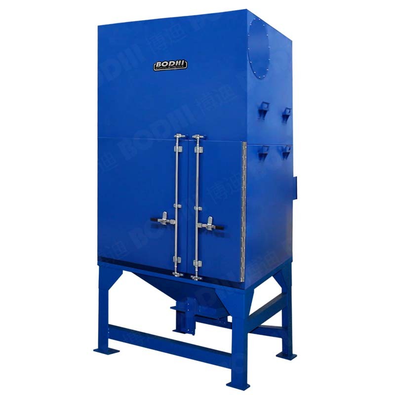 HCD-TFT 系列采用立式滤筒结构,在风机负压的作用下,含尘气体通过主机,烟雾和灰尘首先与预过滤挡板进行碰撞,含尘气体中的大颗粒被撞下,火星被阻隔,同时含尘气体经挡板撞击后能均匀的与过滤器滤筒接触。含尘气体与滤筒接触过程中,粉尘被拦截在滤筒外表面,干净的空气透过滤筒经风机排放到车间或室外。过滤效率可达 99.9%。因为 HCD-TFT 系列采用竖直悬挂的滤筒,附着在滤筒表面的粉尘受重力作用可自动落入集灰桶。