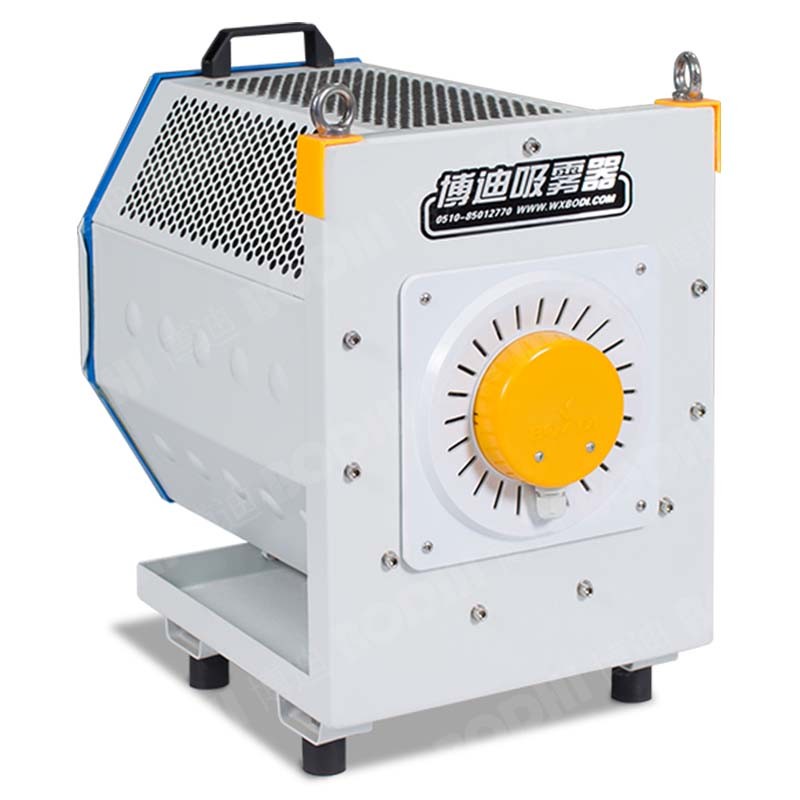 叶轮高速旋转产生真空负压,将含油雾的空气吸入油雾净化器进风口,吸入的油雾气体首先进入可拆初效过滤网,液相油雾粒子被滤网过滤下来,附着在滤网表面并且聚集成滴,滴入集油槽,形成初次过滤。气相的气溶胶粒子在叶轮的推动下而成气流旋涡整形,迫使凝集成液相,经过中效过滤器拦截,二次聚集滴入集油槽,形成二次气体过滤。处理后的气体再经过高压过滤器,第三次过滤排出。净化后的空气可以排入室内循环使用,而分离出来的油排入收集筒后,也可再度使用。