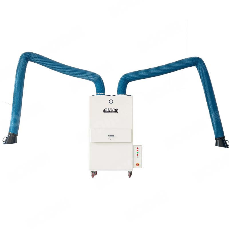 1、镀锌/不锈钢吸气臂支架 2、控制面板、压差表 3、两定两动4个万向轮 4、可拆卸清灰抽屉 5、高效进口滤材 6、电线盘线器 |