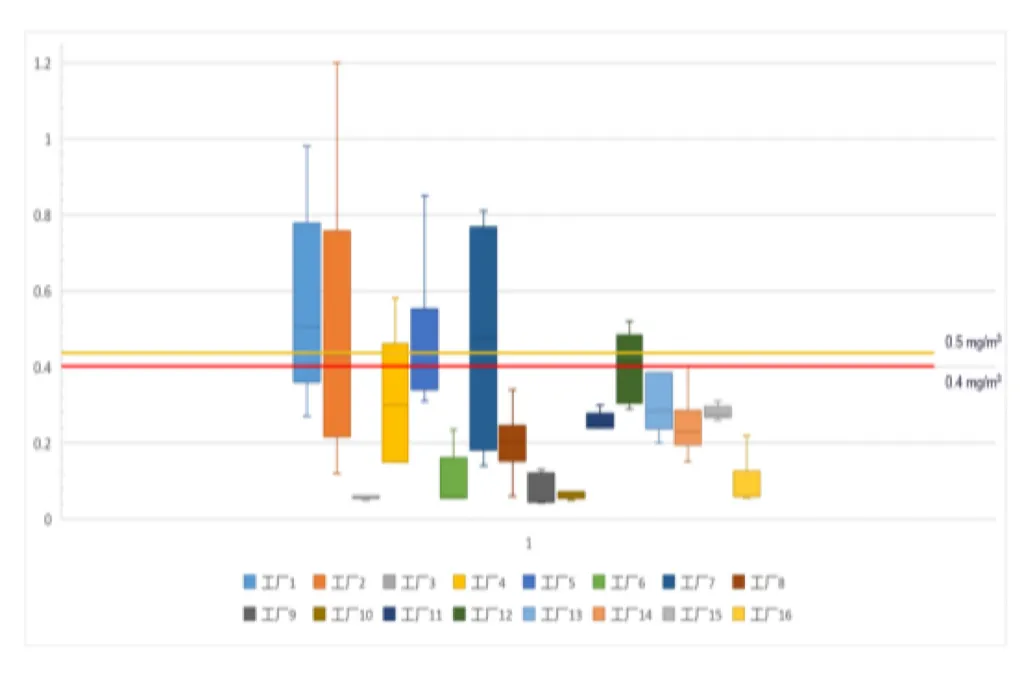 由图1可知,有10个工厂的检测结果完全在限值0.4mg/m?以下;在6组与限值相交的图形中,其中5个的中位数(Box内的横线)位于限值0.4 mg/m?以上;1个工厂的zui大值1.2mg/m?达到了建议限值的3倍。